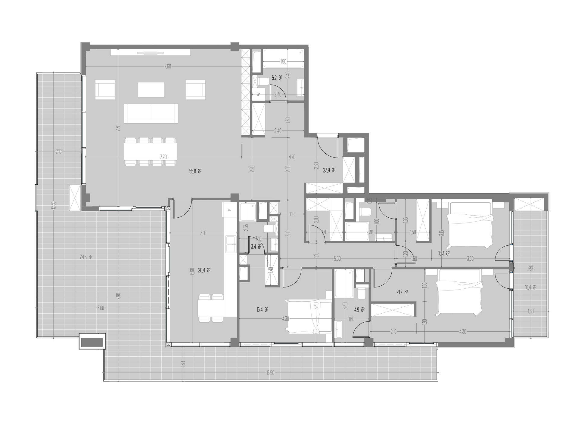 - სველი წერტილი 2 : 3.9 კვ.მ