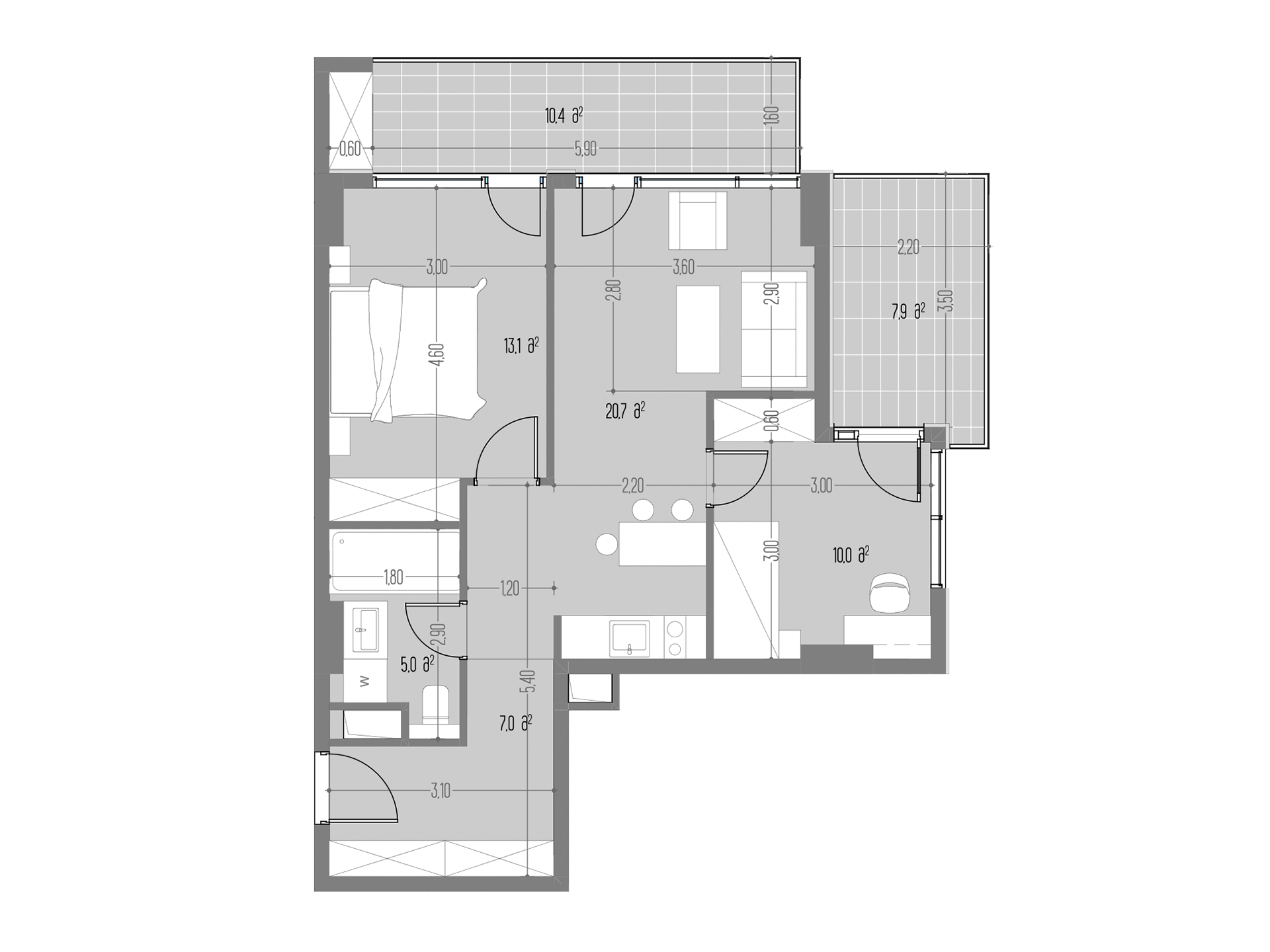 - საცხოვრებელი ფართი : 57.6 კვ.მ