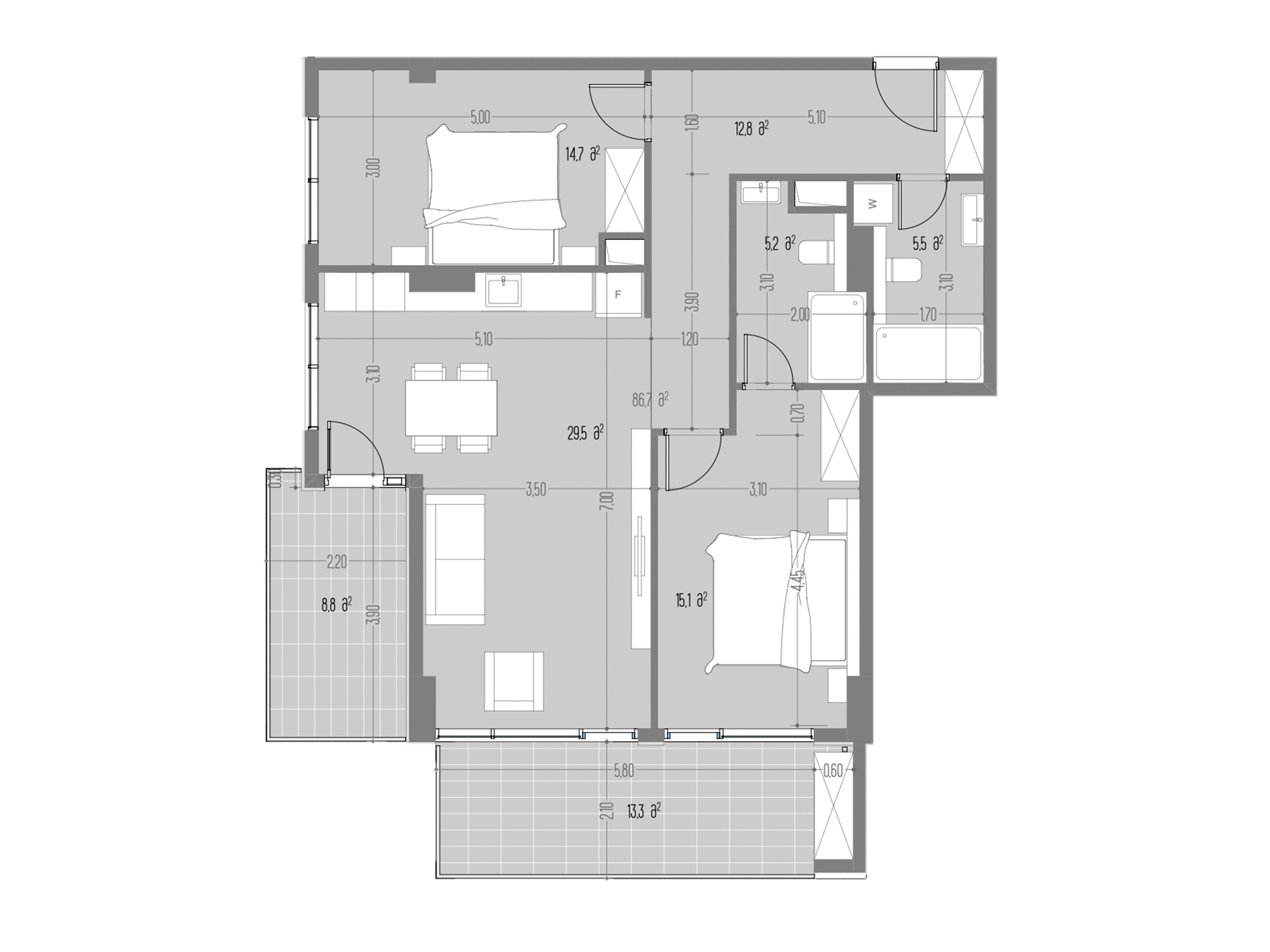 - საცხოვრებელი ფართი : 86.7 კვ.მ